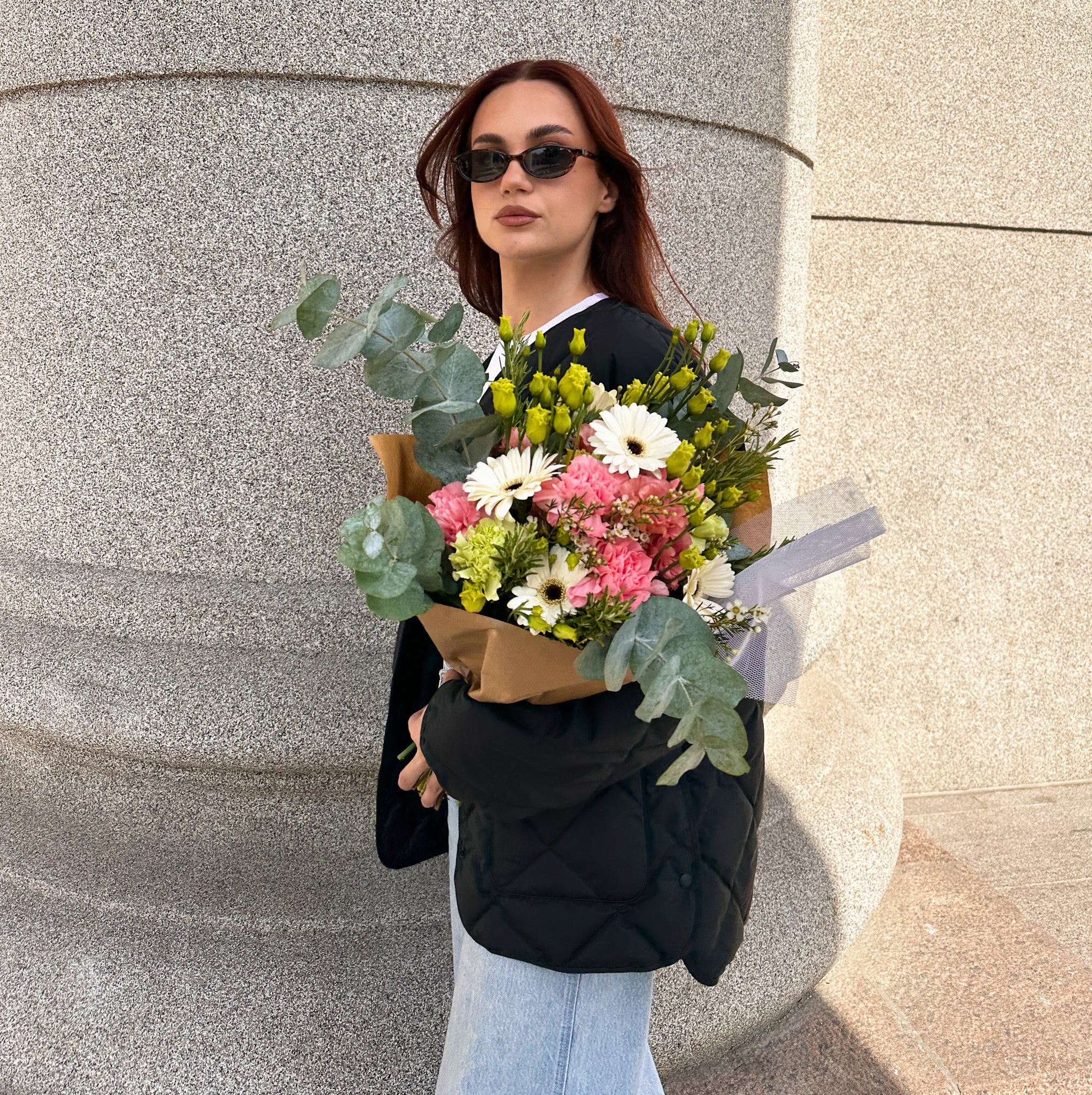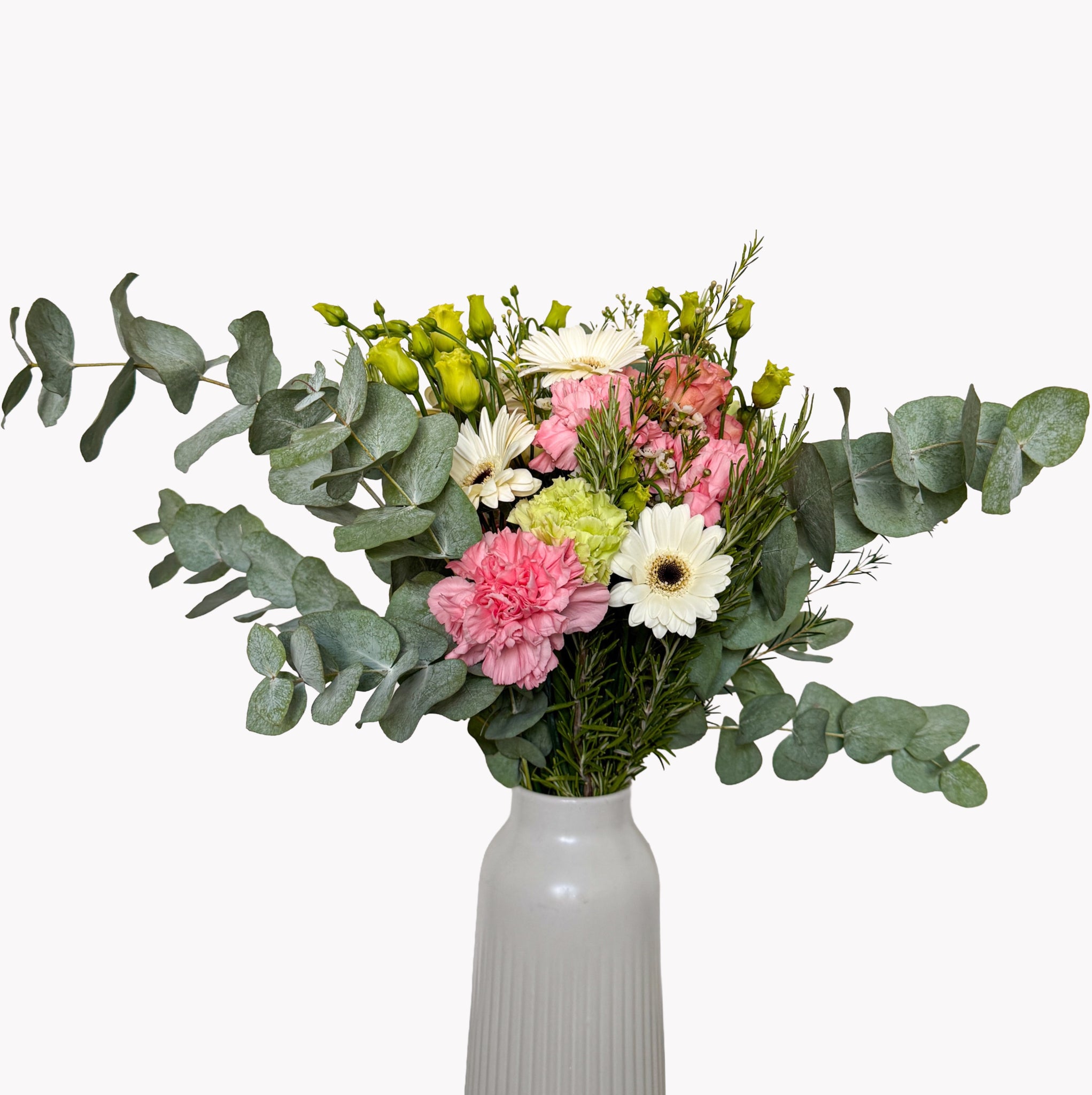 „Žiedų džiaugsmas"– lengva ir šviesi puokštė, kupina spalvų bei gaivos. Rožiniai Gvazdikai, baltos Gerberos, žalios detalės ir Eukalipto šakelės susilieja į harmoningą derinį. Tai puokštė, kuri praskaidrina dieną ir suteikia šventinės nuotaikos.