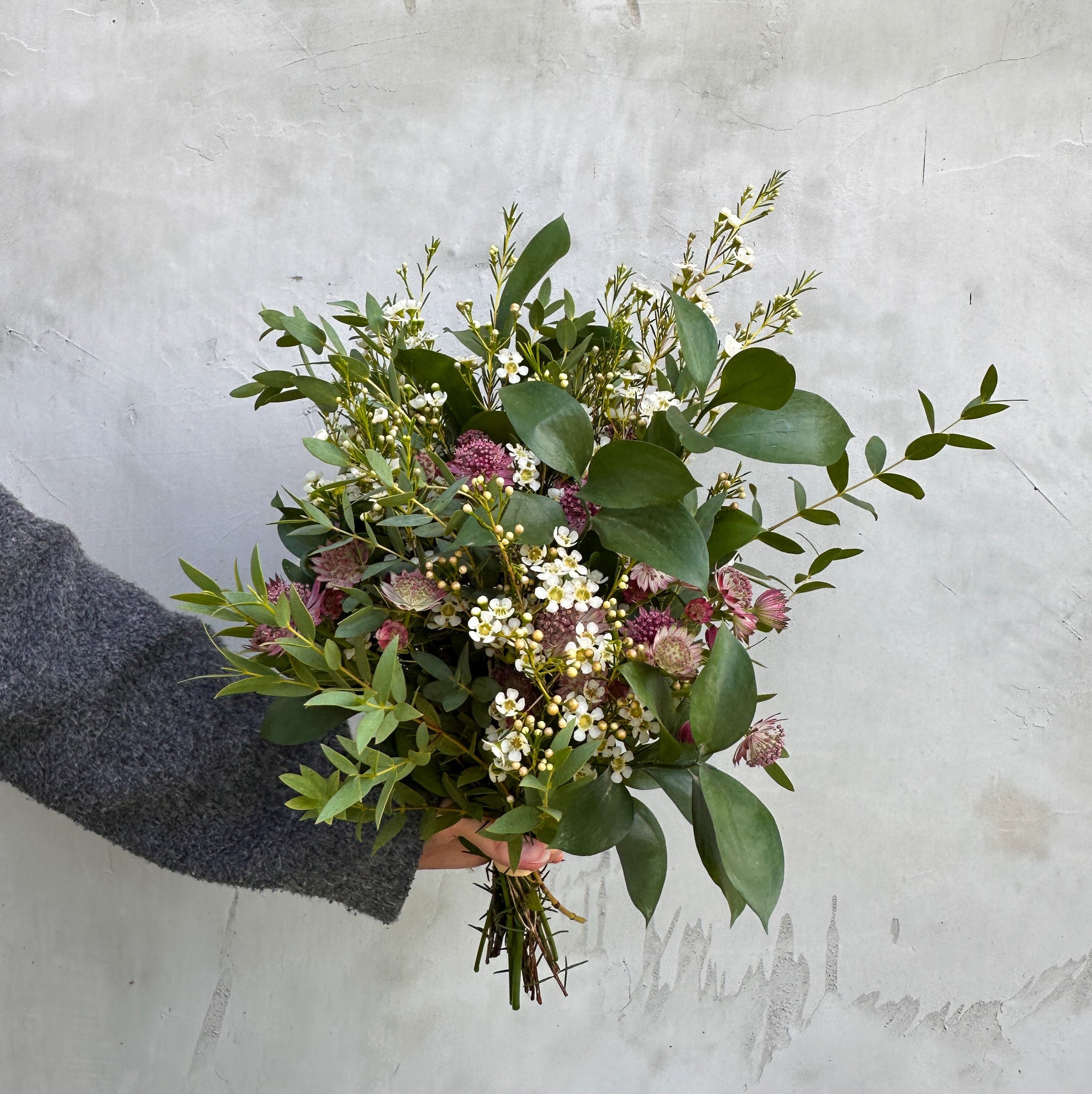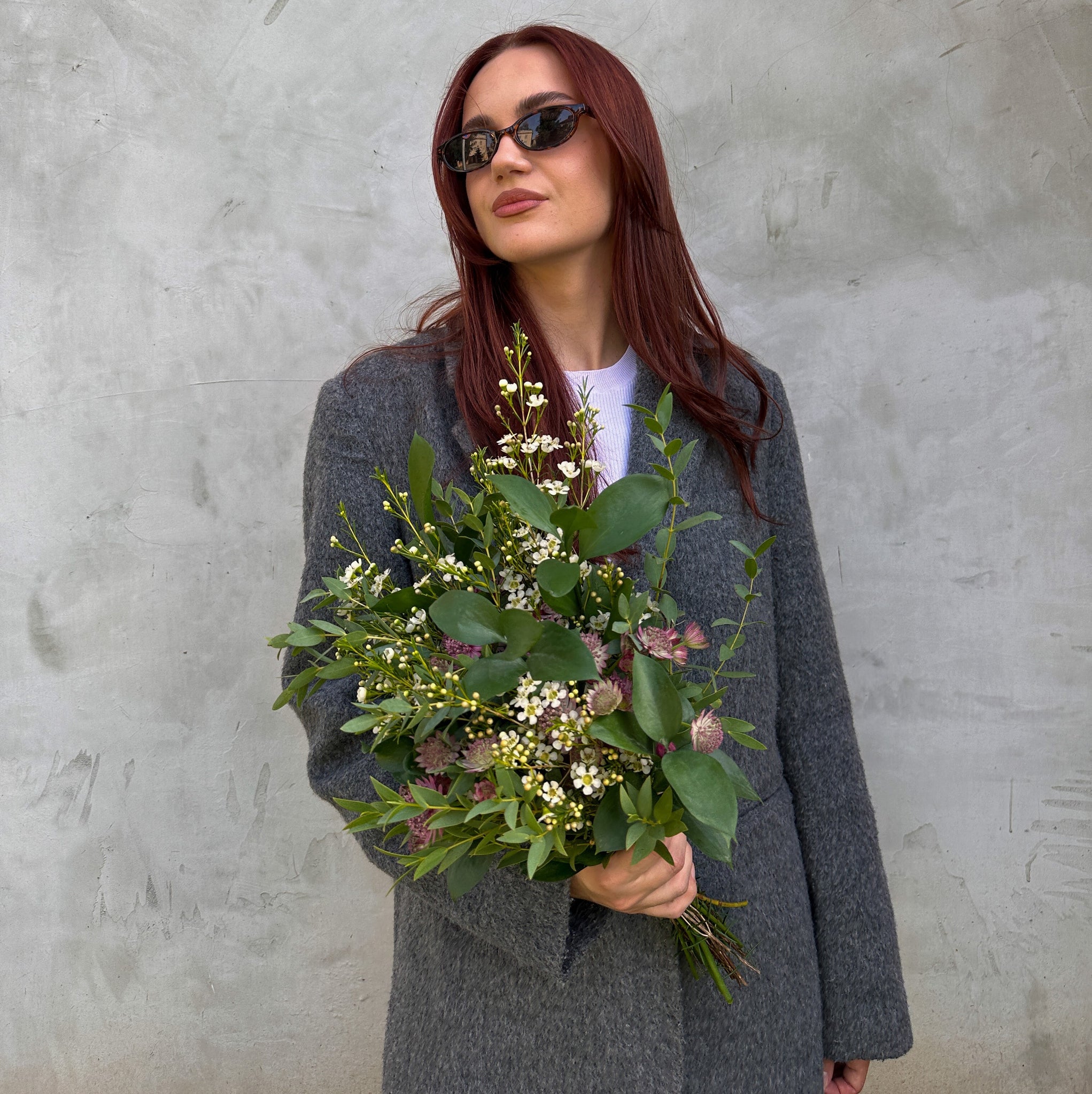 „Žolynų šnabždesys" – tai lengva, natūrali ir poetiška puokštė. Subtilūs baltų žiedelių intarpai, violetiniai akcentai ir gausi žaluma susilieja į darnų pievų šokį. Tai puikus pasirinkimas tiek dovanai, tiek kasdieniam erdvės pagyvinimui.